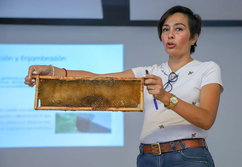 La plática fue impartida por Rosa María Castañeda Elías, quien explicó la importancia de mantener en un lugar tranquilo a las colonias de abejas para evitar peligros y riesgos en la salud a personas potencialmente alérgicas a picaduras.