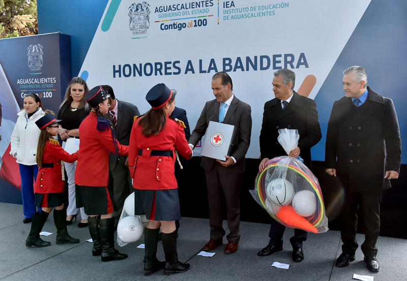 Durante la ceremonia de Honores a la Bandera, el gobernador Martín Orozco Sandoval, hizo entrega de un aula didáctica en la escuela primaria Jesús Terán Peredo en la comunidad Gómez Portugal de Jesús María, cuya inversión fue cercana a los 500 mil pesos, donde también arrancó el Sistema de Denuncia Electrónica, con la finalidad de combatir el acoso escolar o bullying, al interior de los planteles educativos.