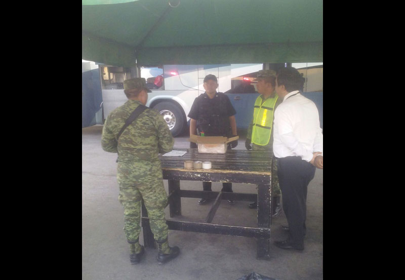 Ante esto le marcaron el alto y le cuestionaron al chofer sobre su punto de origen, indicando que había salido de la Ciudad de México, tras lo cual le indicaron que abriera la zona del equipaje, una vez que lo hizo se dieron a la tarea de revisar el interior del mismo con el apoyo del bonomio canino que luego de unos minutos marcó una de las cajas.