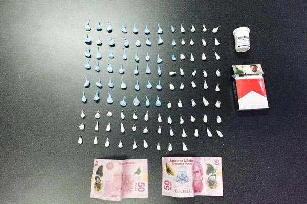 Con más de 100 envoltorios de piedra granulada al parecer “cristal” y polvo blanco con las características de la cocaína fue detenido quien dijo llamarse Jairo Jeovany Mata Padilla por el Grupo Preventivo de Intervención Inmediata en coordinación con la Dirección General de Prevención e Investigación de la Secretaría de Seguridad Pública del Estado.