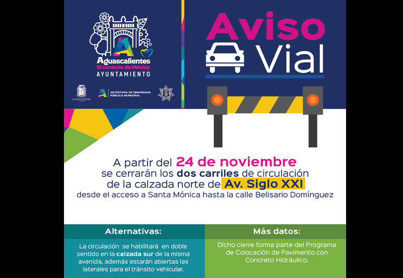 La Secretaría de Obras Públicas Municipales y la Secretaría de Seguridad Pública Municipal de Aguascalientes informan que con motivo del avance de las obras que se realizan en la Avenida Siglo XXI como parte del Programa de Colocación de Pavimento con Concreto Hidráulico, a partir del 24 de noviembre se cerrarán los dos carriles de circulación de la calzada norte, desde el acceso a Santa Mónica hasta la calle Belisario Domínguez.