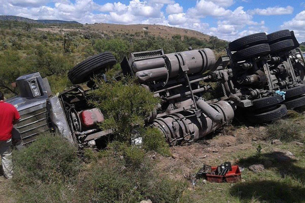 Espectacular choque-volcadura registrado el lunes por la mañana en la carretera Lagos de Moreno-San Luis, luego de que el cansancio venció al chófer de un tráiler que se dirigía a esta ciudad y al dormitar sobre el volante, chocó contra una camioneta. Afortunadamente no hubo personas lesionadas pero los daños fueron cuantiosos.