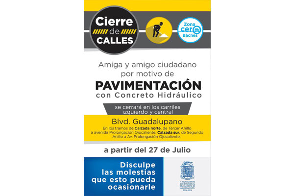 La Secretaría de Obras Públicas del Municipio de Aguascalientes (SOPMA) informa que a partir de este 27 de julio y con motivo de la construcción de pavimento hidráulico, se encuentran cerrados los carriles izquierdo y central del Blvd. Guadalupano, en su calzada norte, en el tramo de Tercer Anillo de Circunvalación a avenida Prolongación Ojocaliente.
