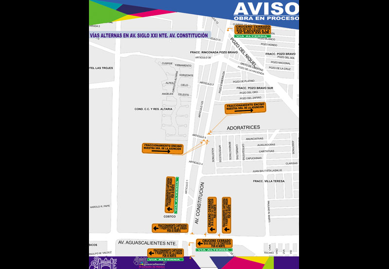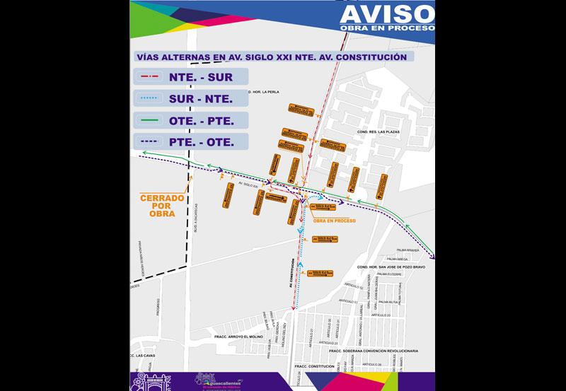 La Secretaría de Seguridad Pública Municipal de Aguascalientes a través de la Dirección de Tránsito y Movilidad, informa que debido a obras de rehabilitación, a partir del 1º de junio, permanecerá cerrado el crucero de Avenida Siglo XXI norte y Avenida Constitución, en primera instancia en los carriles de la calzada sur.