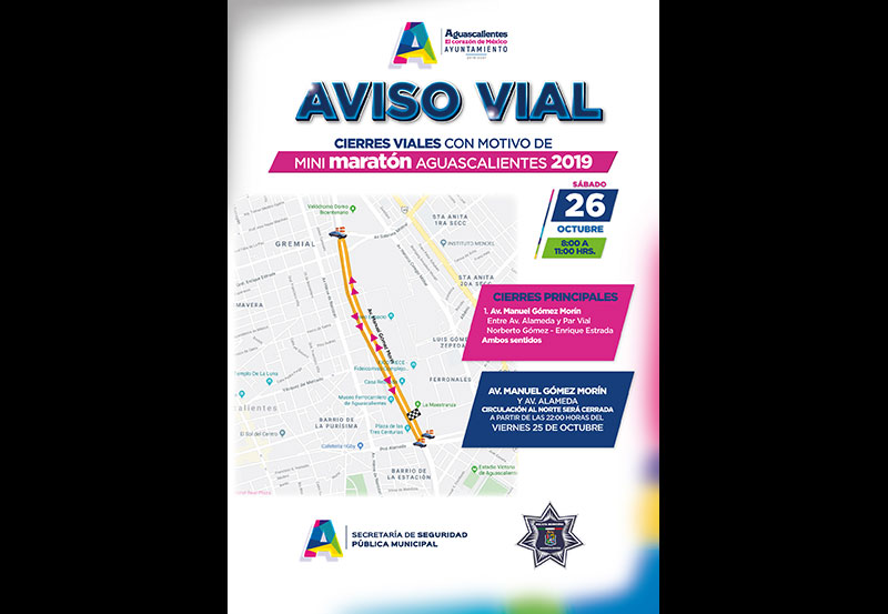 Este sábado 26 y domingo 27 de octubre la Dirección de Tránsito y Movilidad del Municipio capital realizará diversos cierres a la circulación vehicular, por los eventos deportivos Minimaratón, Maratón Aguascalientes y Carrera Exa Run and Fest 2019.