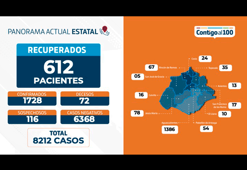 De acuerdo al último reporte emitido por el Instituto de Servicios de la Salud de Aguascalientes (ISSEA), los contagios siguen aumentando en grupos de aproximadamente 60 personas, sumando al día de hoy un total de mil 728 casos positivos desde que inició en la entidad la pandemia, el 15 de marzo de este año.