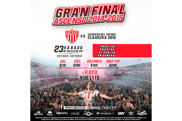La Directiva del Club Necaxa hace la atenta invitación a toda la afición de los Rayos para que adquiera sus boletos con anticipación y pueda ser parte de esta Gran Final donde el equipo de Aguascalientes peleará por el Ascenso a la Liga Bancomer MX.