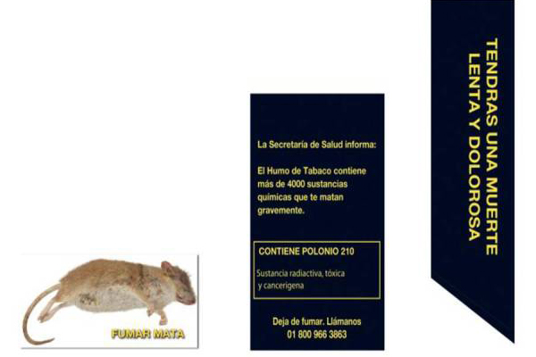 Las advertencias y mensajes sanitarios, que deben cubrir el 100 por ciento de la cara posterior y el 100% de un costado lateral de las cajetillas y paquetes, son: