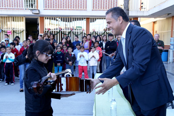 «Me da mucho gusto estar aquí haciendo entrega de estos instrumentos con los que los jóvenes del municipio que participarán en la Orquesta porque es un proyecto que pensamos hace algún tiempo y poco a poco vamos cristalizando el sueño. Espero que los aprovechen y el propósito de alejarlos de la delincuencia y las adicciones a través de la cultura, lo cumplamos juntos», señaló el alcalde.