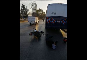 Policías Viales de Aguascalientes atendieron reporte de accidente entre una motocicleta y un camión de pasajeros en Avenida Siglo XXI y Avenida Belisario Domínguez en la colonia Insurgentes, sin que se registraran personas lesionadas.