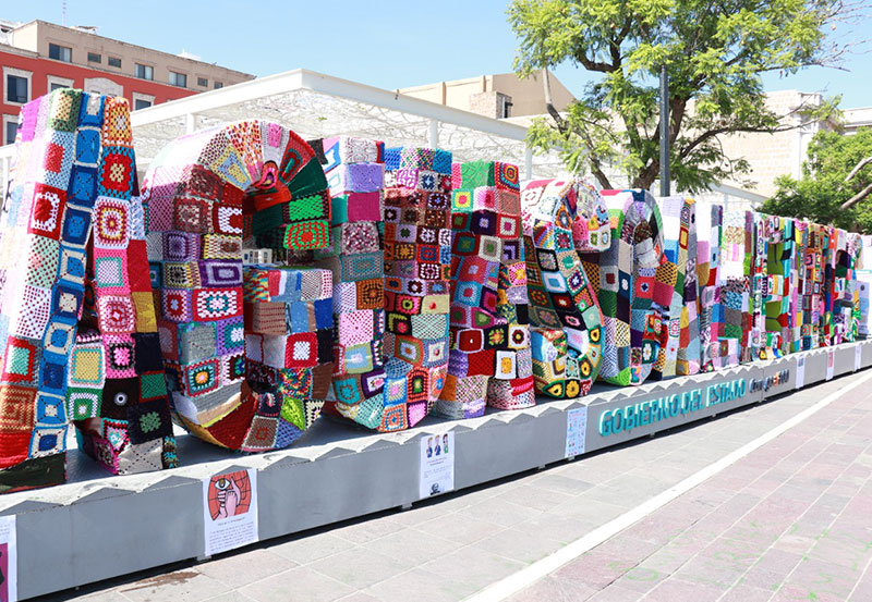Como parte de la campaña Graffii Tejido se elaboraron cuadros tejidos con los que se vistieron lugares públicos en todos los municipios y en el centro histórico de la ciudad capital