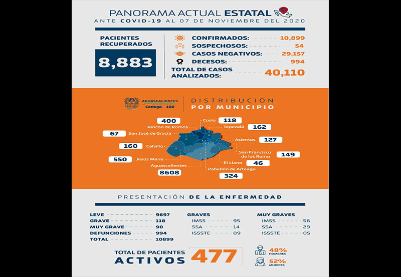 Al día de hoy se reportan 10 mil 899 pacientes detectados con el virus SARS-Cov-2 en Aguascalientes, de los cuales 188 han sido foráneos que han recibido pruebas y atención en nuestra entidad.