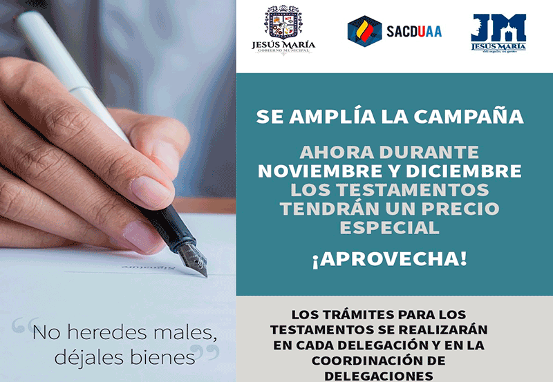 El Municipio de Jesús María, a través de la Coordinación de Delegaciones informa que se extiende el periodo de la campaña testamentaria, puesta en marcha el pasado mes de septiembre.