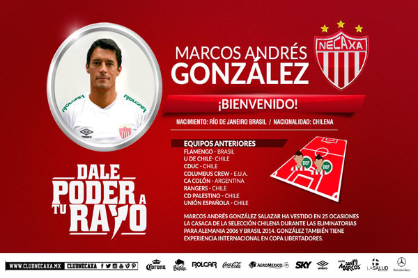 Club Necaxa anuncia la contratación del defensa central chileno Marcos González como nuevo refuerzo extranjero para el Torneo Apertura 2015 del Ascenso Mx.