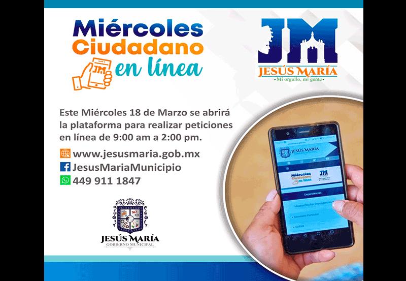 Como resultado de la contingencia de salud ante el brote del virus COVID-19 y en atención a las medidas preventivas para evitar contagios, el Gobierno Municipal de Jesús María informa que a partir de este 18 de marzo y hasta nuevo aviso el Miércoles Ciudadano se llevará a cabo de manera virtual.