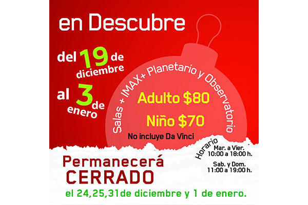 Delgadillo Gómez destacó que a partir del 21 de diciembre y hasta el 4 de enero el horario de atención será de martes a viernes de las 10:00 a las 18:00 y los fines de semana de las 11:00 a las 19:00 horas. Sin embargo, Da Vinci en ambos días recibirá público hasta las 20:00 horas.