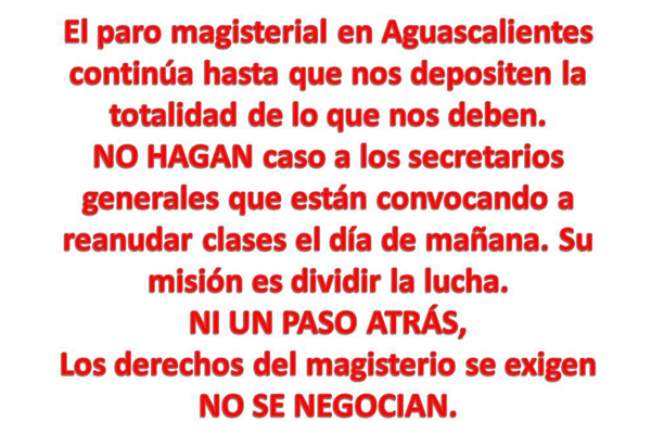 Los anuncios de la Sección Uno del SNTE han sido ignorados por las bases, pues la dirigencia sindical ha perdido credibilidad ante el Magisterio de Aguascalientes, toda vez que los maestros se organizan entre ellos y convocaron a mantener el paro de labores en tanto que no se les pague lo que les adeudan.