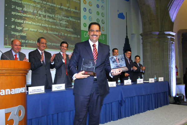 El Presidente Municipal recibió los galardones de manos de Alejandro Murat, Director General de INFONAVIT y Juan Carlos Belaustegüigoitia, Director Ejecutivo del Centro Mario Molina; otorgados por el Banco Nacional de México S.A. (BANAMEX), Banco Nacional de Obras y Servicios Públicos, S.N.C, (BANOBRAS) y el Instituto del Fondo Nacional de la Vivienda para los Trabajadores, (INFONAVIT), durante la presentación del Índice de Ciudades Competitivas y Sustentables 2014, celebrada en la ciudad de México.