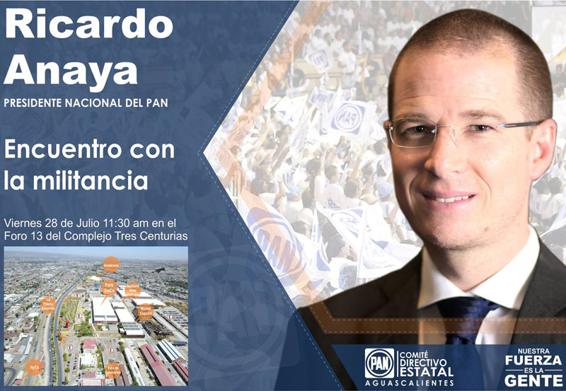 Ricardo Anaya, presidente nacional del PAN, estará en Aguascalientes este viernes 28 de julio a las 11:30 horas. En lo que han denominado un “encuentro con la militancia”, el aspirante a candidato de Acción Nacional a la Presidencia de México hará campaña en el Foro 13 del Complejo Tres Centurias, donde se podrá ver, eso asegúrelo, a empleados municipales y estatales en un acto partidista a pesar de ser horario laboral. ¿O pedirán el día sin goce de sueldo?