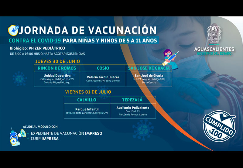 El gobernador del estado, Martín Orozco Sandoval, anunció que el próximo 30 de junio comenzarán las jornadas de vacunación contra Covid-19 para niñas y niños de 5 a 11 años en los municipios de Rincón de Romos, Cosío y San José de Gracia; mientras que el 01 de julio se realizarán en Calvillo y Tepezalá.