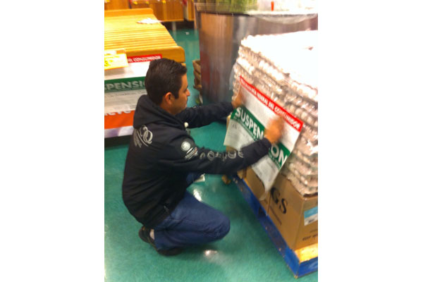 Debido a que en Tiendas Soriana de Plaza Universidad, ubicada en Avenida Universidad esquina Avenida Aguascalientes, fraccionamiento Bosques del Prado Sur, se registró incumplimiento a la Ley Federal de Protección al Consumidor en los artículos (1) No informa adecuadamente y de forma clara sobre las especificaciones correctas referente a cantidad, características, composición, calidad y precios; y (7) No informa los precios, tarifas, garantías, cantidades, calidades, medidas, intereses, cargos, términos, plazos, fechas y demás condiciones en las que ofrece el producto, en este caso no se exhibía fecha de caducidad, lugar de origen y marca, se implementó la medida precautoria de suspensión de la comercialización de bienes, productos y servicios a aproximadamente 150 charolas de huevo blanco, con 30 piezas cada una.