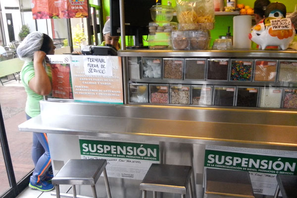 Se suspendió la comercialización de pago de cuenta vía tarjeta de crédito en Jugos y Chocos Tony, ubicado en Av. Independencia No. 1820-1, debido a que el proveedor aplicaba un cobro extra de 3% al monto a pagar por realizar dicha transacción con tarjeta de crédito, acción que violenta los derechos de las y los consumidores y está descrita en la Ley Federal del Consumidor en el Artículo 7 BIS, y en verificación realizada por Profeco Delegación Aguascalientes se impuso la medida precautoria.