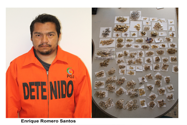 Personal de la Policía Ministerial del Estado, llevaron a cabo la detención de quien dijo llamarse Enrique Romero Santos de 38 años originario de Tlajomulco de Zúñiga en el Estado de Jalisco, toda vez que está señalado como probable responsable el delito de robo en contra de la empresa Orfebres Saldaña, originaria de Guadalajara y dedicada a la compra y venta de oro.