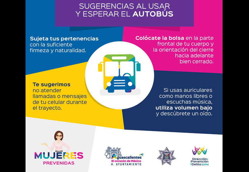 En atención a las sugerencias realizadas a través de los Comités Vecinales para fortalecer la seguridad de las mujeres en espacios públicos, la Secretaría de Seguridad Pública Municipal de Aguascalientes a través de la Dirección de Prevención del Delito emite de manera general las siguientes recomendaciones dirigidas a mujeres al momento de utilizar o esperar el transporte público urbano: