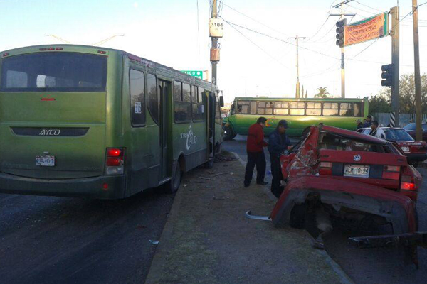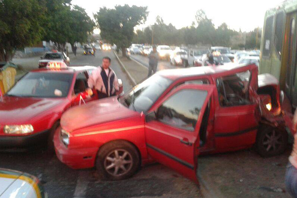 El chofer Luis Ernesto Hernández García de 25 años de edad, quien trae a su cargo el camión urbano de número económico 316, circulaba sobre Avenida Aguascalientes en el sentido de oriente a poniente, cuando poco antes de llegar al cruce de la Avenida Mariano Hidalgo, observó que el semáforo estaba en rojo, por lo que trató de frenar, sin embargo no pudo, impactando por alcance a un Chevy gris conducido por Mayra Cortez Acosta de 33 años de edad, a quien proyectó hacia un poste. Después chocó a un Jetta rojo tripulado por Víctor Hugo Ibarra de 38 años de edad, a quien subió al camellón que divide la lateral y este vehículo impactó al taxi conducido por Baudelio Herrera de Montoya de 62 años. Tras el accidente resultaron lesionados los conductores del Chevy y del Jetta que fueron llevados al Hospital General 2 del Seguro Social.