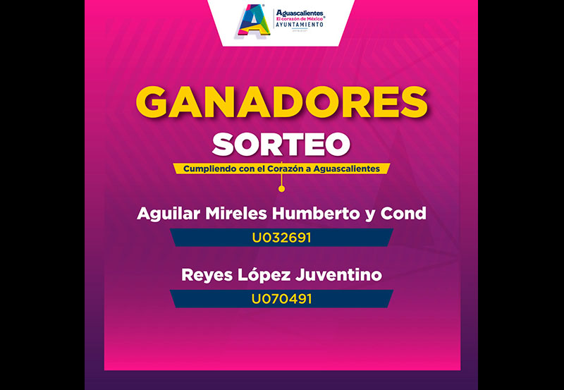 La mañana de este lunes, la alcaldesa Tere Jiménez llevó a cabo de manera virtual el sorteo “Cumpliendo con el Corazón a Aguascalientes, Predial 2020” en el que resultaron ganadores de los dos automóviles nuevos: Humberto Aguilar Mireles y Cond., número de cuenta U032691 y Juventino Reyes López, número de cuenta U070491.