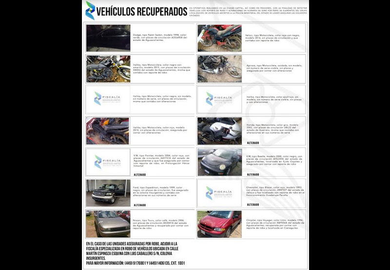 La primera acción se llevó a cabo en el fraccionamiento Jardines de Aguascalientes, cuando Agentes Investigadores del Grupo de Localización de Vehículos cumplimentaron una orden de cateo solicitada por el Agente del Ministerio Público de la Fiscalía Especializada en Robo de Vehículos y librada por el Juez de Control y Juicio Oral Penal; en el lugar, los elementos ministeriales lograron la recuperación de un vehículo de la marca Dodge, tipo Neón Sedán, modelo 1998, color verde, con placas de circulación ADG690B del estado de Aguascalientes.