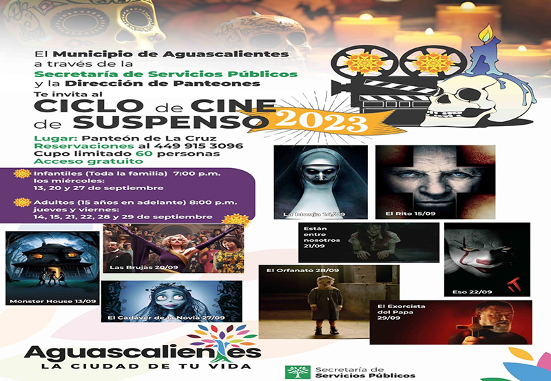 La Secretaría de Servicios Públicos, a través de la Dirección de Panteones, presenta el cartel para el “Ciclo de cine de suspenso”, el cual se llevará a cabo en las instalaciones del Panteón de La Cruz, los miércoles, jueves y viernes de septiembre a partir del día 13.