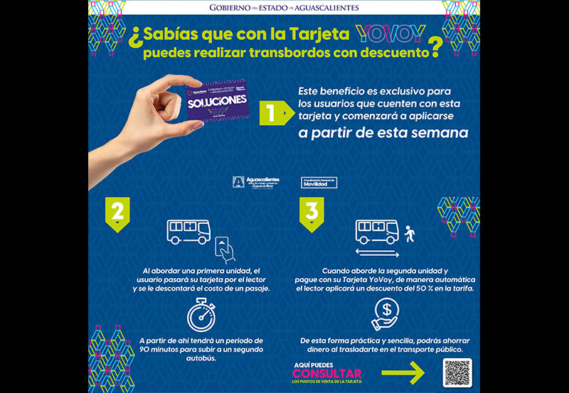 Para aprovechar este descuento, válido en todas las rutas, es necesario contar con la tarjeta YoVoy, que además de los transbordos tiene otras ventajas, como mayor agilidad al abordar los camiones y una tarifa más económica; quienes aún no la tengan pueden adquirirla en establecimientos autorizados así como en el módulo de la CMOV que se instala los Jueves de Bolsa de Trabajo, en esta ocasión en FICOTRECE y posteriormente cada jueves en Palacio de Gobierno. El costo es de 35 pesos, e incluye un pasaje.