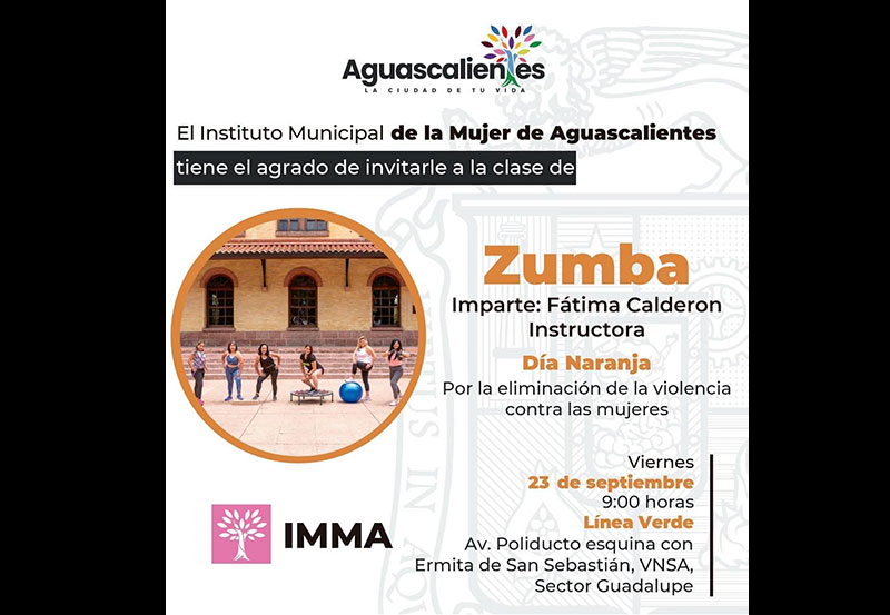 La presidencia municipal, a través del Instituto Municipal de la Mujer de Aguascalientes (IMMA) invita a la población en general a una clase de zumba, la cual se llevará a cabo el día viernes 23 de septiembre, a las 9:00 horas, en avenida Poliducto esquina con Ermita de San Sebastián, en Villas de Nuestra Señora de la Asunción sector Guadalupe, al oriente de la capital sobre la Línea Verde.