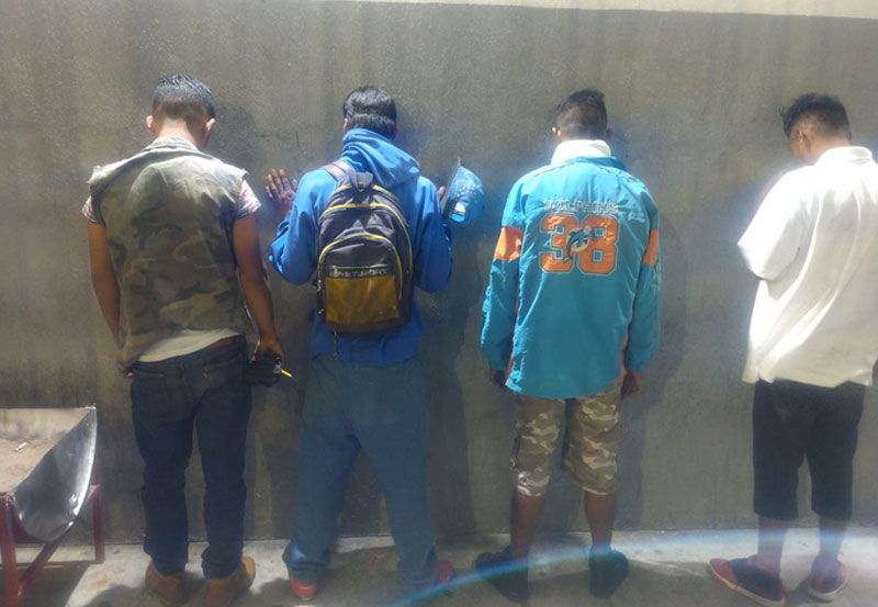 La detención de quienes dijeron llamarse Jesús «N» de 26 años, Néstor «N» de 30 años, Iván «N» de 27 y Julio «N» de 22 años de edad, se llevó a cabo sobre la calle Ocote a la altura de los números 100 del fraccionamiento Ojocaliente III, cuando los vecinos de la zona reportaron al C4 Municipal de Aguascalientes que cuatro personas del sexo masculino manipulaban las manijas y observaban el interior de los vehículos estacionados en la vía pública.