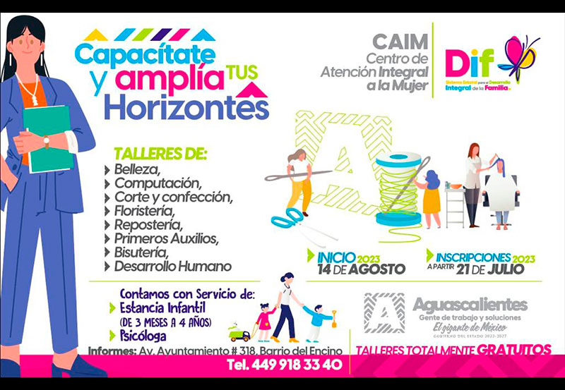 El DIF Estatal invita a mujeres de 15 a 60 años de edad a inscribirse a los talleres gratuitos de belleza, corte y confección, primeros auxilios, repostería, floristería, computación, desarrollo humano y bisutería, que se brindarán en el Centro de Atención Integral a la Mujer (CAIM).