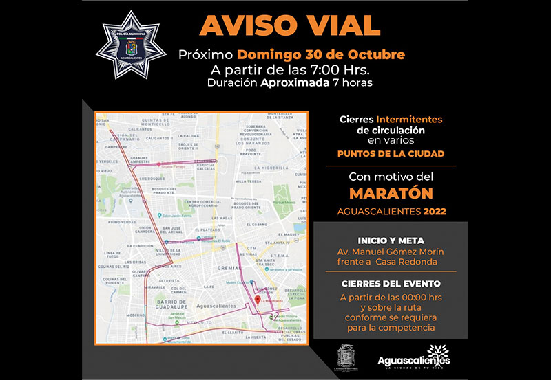 La Secretaría de Seguridad Pública del Municipio de Aguascalientes informa que implementará un operativo vial con motivo del “Maratón Aguascalientes 2022”, mismo que iniciará por la noche del viernes 28 de octubre, por lo que se recomienda a la ciudadanía tomar las debidas precauciones para evitar contratiempos.