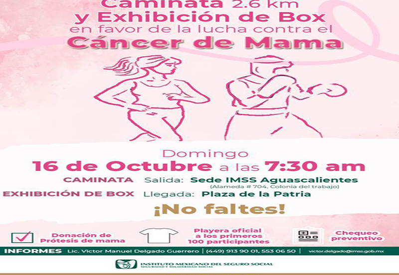Como parte de las actividades del Mes de Sensibilización del Cáncer de Mama, el Instituto Mexicano del Seguro Social (IMSS) en Aguascalientes invita a personas de todas las edades a participar el próximo domingo 16 de octubre, en una Caminata de 2.6 kilómetros y una Exhibición de Box, que se llevarán a cabo en favor de la lucha contra el Cáncer de Mama.