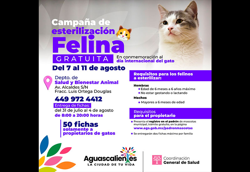 Con el propósito de celebrar el Día Internacional del Gato, además de sensibilizar a la ciudadanía respecto a la importancia de la tenencia responsable de mascotas, el Municipio de Aguascalientes, a través de la Coordinación General de Salud realizará una campaña de esterilización gratuita para felinos, del 7 al 11 de agosto, en las instalaciones del departamento de Salud y Bienestar Animal.