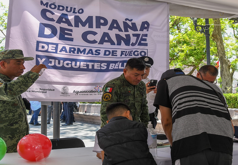 Concluyó la “Campaña de canje de armas de fuego y juguetes bélicos 2023” que impulsó la Secretaría de Seguridad Pública Municipal de Aguascalientes (SSPM) en coordinación con la Secretaría de la Defensa Nacional (SEDENA), con un saldo de 24 armas cortas y 11 pistolas de aire y gas, 385 cartuchos de diversos calibres y 25 cargadores que fueron entregados por la población, a quien se le entregó un beneficio económico.