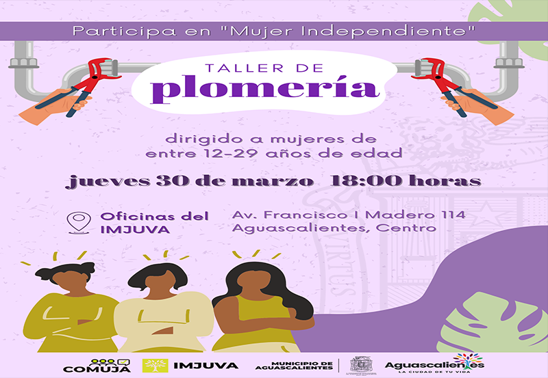 El Instituto Municipal de la Juventud de Aguascalientes (Imjuva) en colaboración con el Consejo Municipal de la Juventud de Aguascalientes (COMUJA), invitan a mujeres que quieran aprender sobre plomería al taller “Mujer Independiente”, que se llevará a cabo el jueves 30 de marzo a las 6 de la tarde en las instalaciones del instituto.