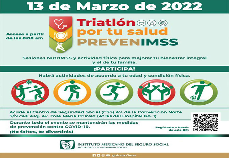 El Instituto Mexicano del Seguro Social (IMSS) en Aguascalientes convoca a personas de todas las edades, géneros y condición física a participar en el Primer Triatlón PrevenIMSS “Corre, Brinca, Rueda”, este domingo 13 de marzo, en las instalaciones del Centro de Seguridad Social (CSS).
