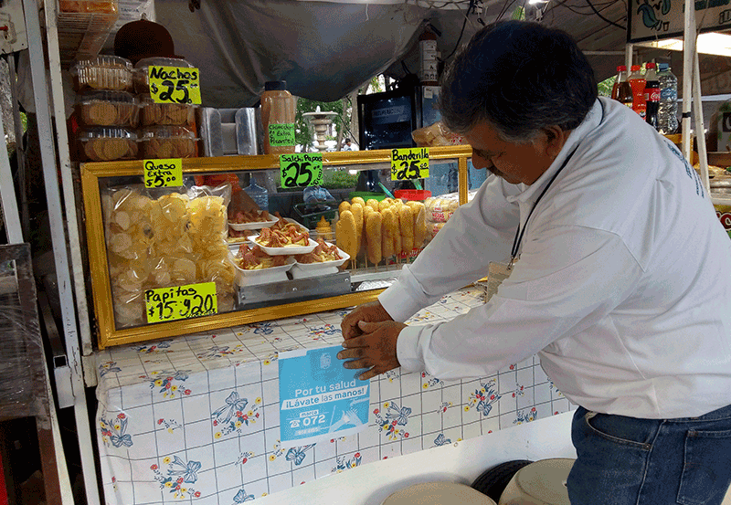 14 inspectores de la Dirección de Salud Pública Municipal realizan recorridos diarios por la Plaza de la Patria, calle Moctezuma y andador Benito Juárez, revisando que la comida que se ofrece a los peregrinos y visitantes se elabore con limpieza, de tal forma que se garantice el consumo de alimentos higiénicos.