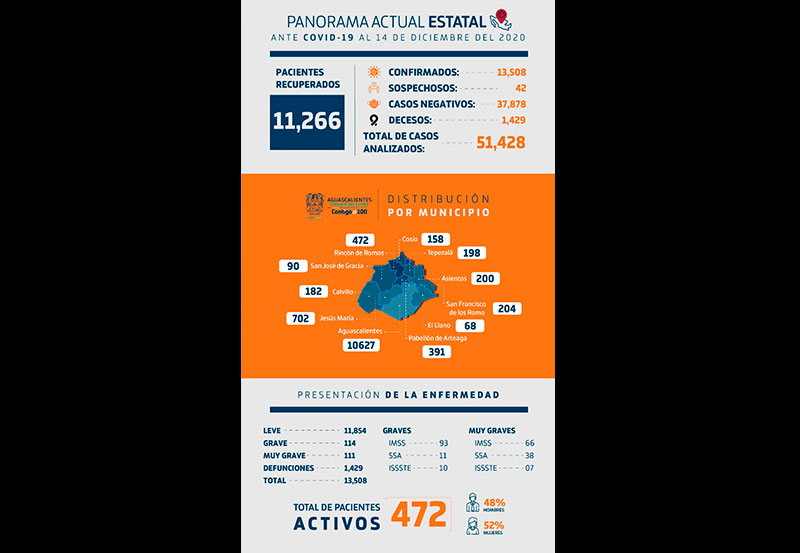 Hasta el día de hoy, el acumulado es de mil 409 defunciones, de las cuales 10 se registraron en las últimas 24 horas; hubo 73 nuevos pacientes positivos a coronavirus con los que la entidad alcanzó 13 mil 508 casos. De las 51 mil 428 pruebas realizadas, 37 mil 878 han sido negativas.
