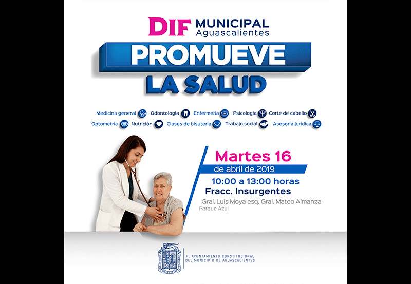 El Municipio de Aguascalientes convoca a la población para asistir a la Jornada DIF Promueve la Salud, que se llevará a cabo este martes 16 de abril en el Fraccionamiento Insurgentes.
