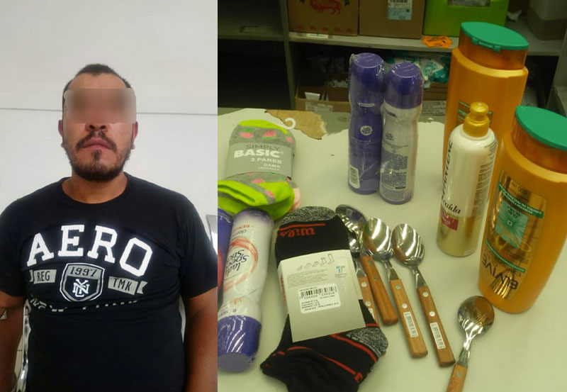 Por lo anterior los policías procedieron a efectuar una revisión preventiva a quien manifestó llamarse Juan Carlos N de 30 años de edad, en su poder le localizaron: dos paquetes de desodorantes, una crema para el cabello de shampoos, dos paquetes que contenían tres pares de tines cada uno y 5 cucharas con mango de madera, cuyos productos en total sumaron casi 500 pesos.
