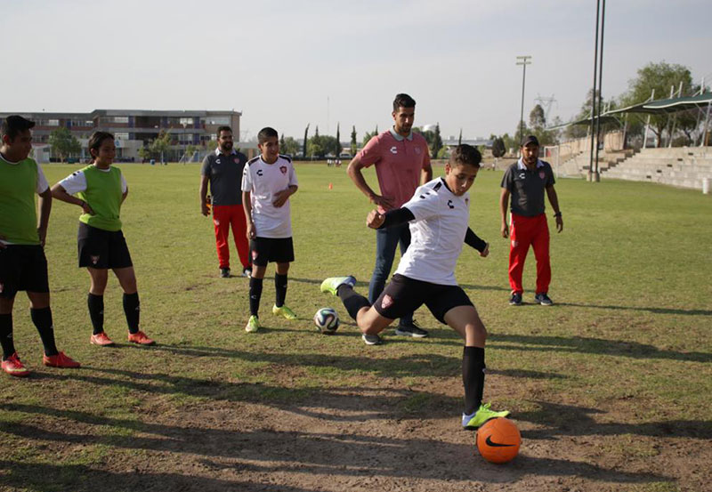 Personal de la Escuela de Futbol Necaxa asignó categorías a los futbolistas, quienes fungieron como monitores al guiar y enseñar a los niños cómo realizar sus ejercicios de forma adecuada.