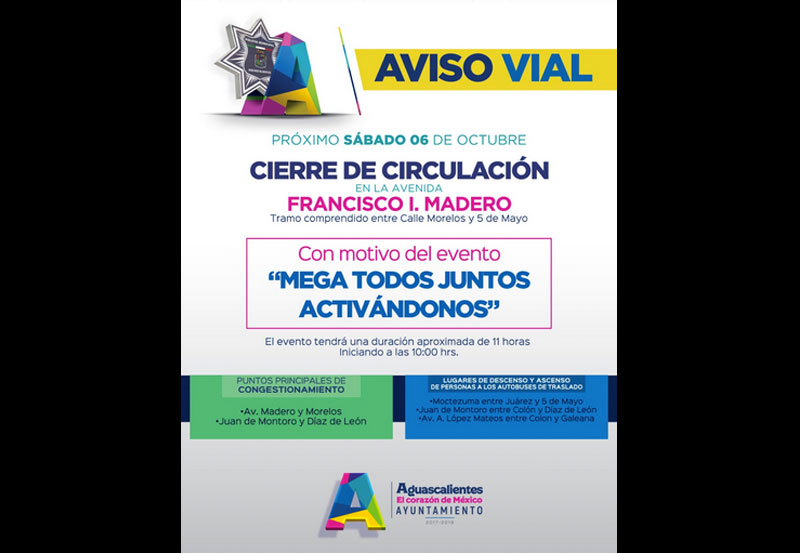 La Secretaría de Seguridad pública Municipal de Aguascalientes a través de la Dirección de Tránsito y Movilidad informa a la ciudadanía sobre dispositivo de seguridad y vialidad que se implementará el próximo sábado 6 de octubre sobre la calle Francisco I. Madero y arterias contiguas a la Plaza Principal de la Ciudad con motivo del evento denominado «Mega Todos juntos Activándonos”.