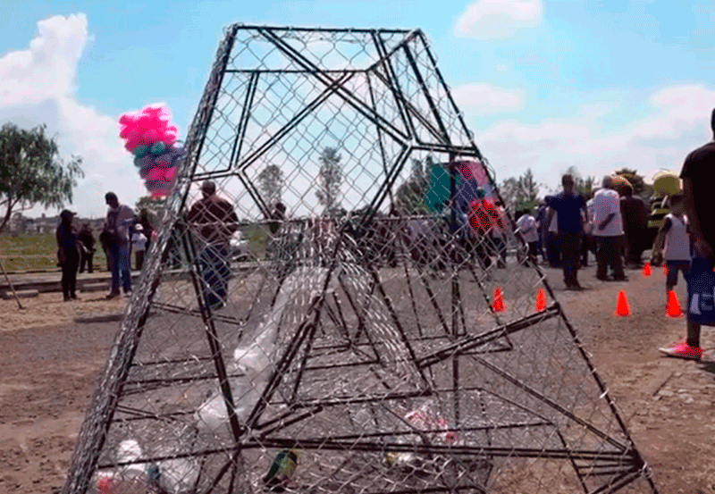 En esta ocasión, se trata de una letra A volumétrica elaborada con sobrantes de malla ciclónica y varilla, con capacidad de un metro cúbico para la recepción y aprovechamiento de botellas de PET.