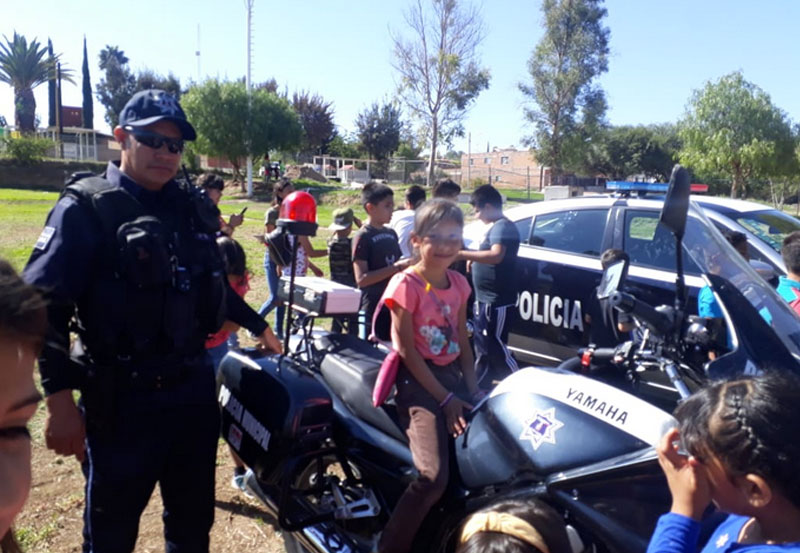 Integrantes de la Secretaría de Seguridad Pública del Estado así como policías municipales de San Francisco de los Romo, participaron en el programa “Vacaciones Felices” en donde convivieron con poco más de 150 niños, que pudieron conocer de cerca sus actividades así como diversas medidas de prevención.
